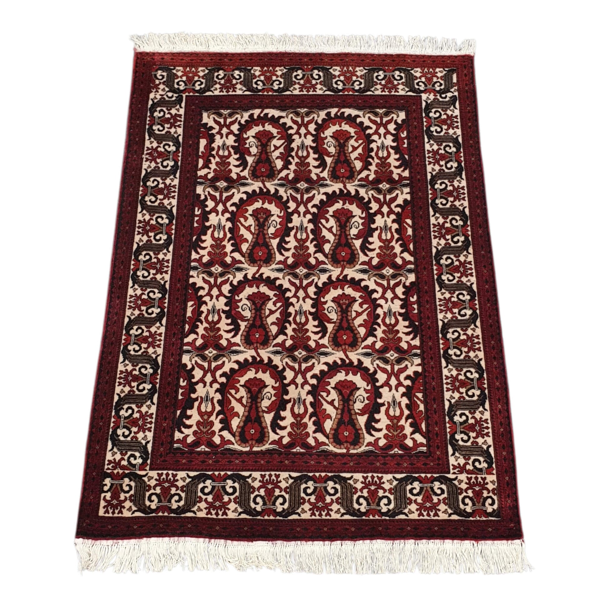 The Afghan Ersari Rug, exemplifies the skilled weaving traditions of the Ersari tribe. Featuring bold geometric motifs and a rich color palette, this handspun wool rug offers both aesthetic appeal and durability. Its authentic design and craftsmanship make it a valuable addition for collectors and connoisseurs seeking genuine fine Afghan textiles with cultural depth.