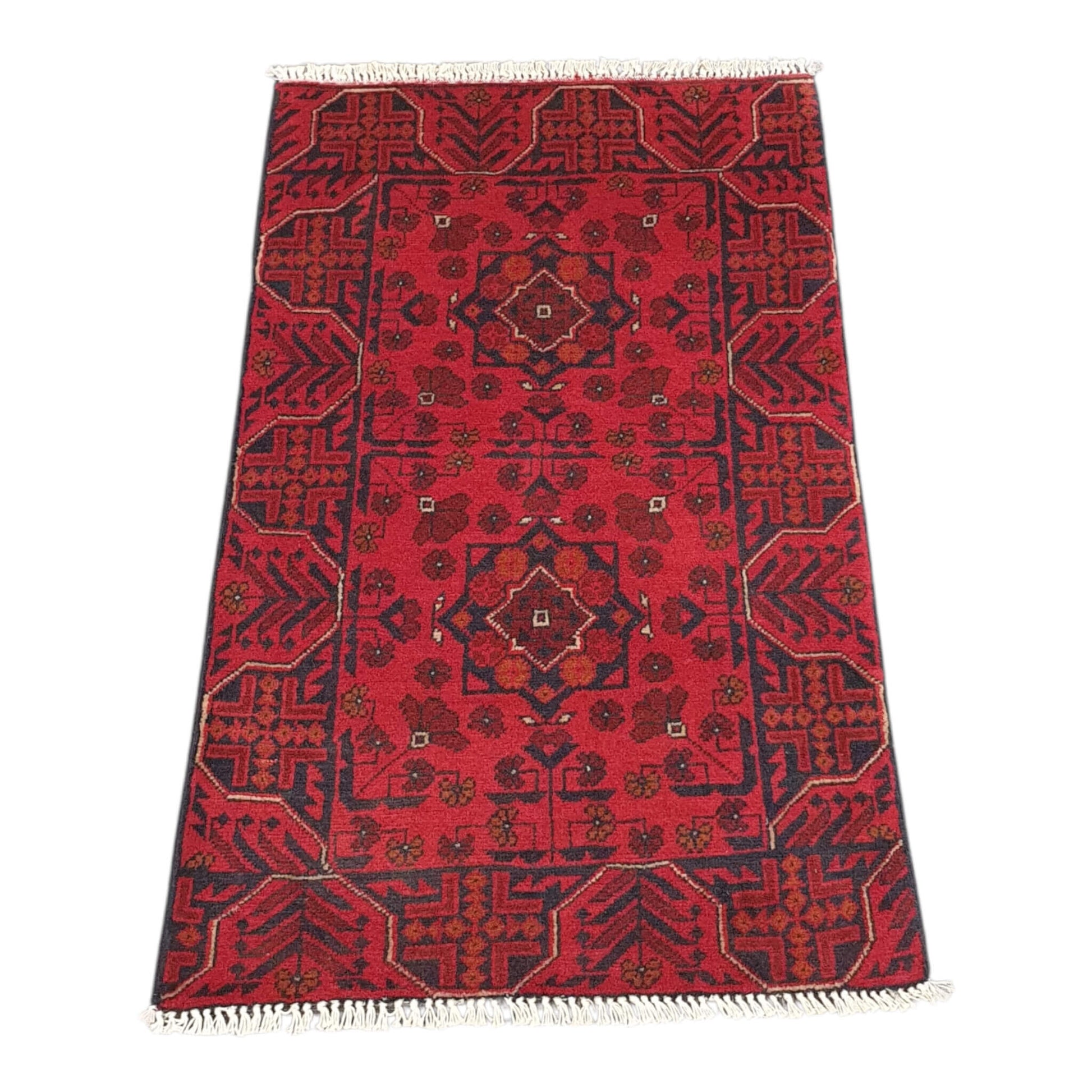 This rug is a fine example of traditional Afghan craftsmanship. Known for its intricate patterns and rich red colors, this rug adds a touch of cultural heritage and elegance to any space. Its compact size makes it ideal for accentuating smaller areas while showcasing authentic handwoven artistry. Perfect for heavy traffic areas & for people seeking genuine Afghan rugs with enduring quality.