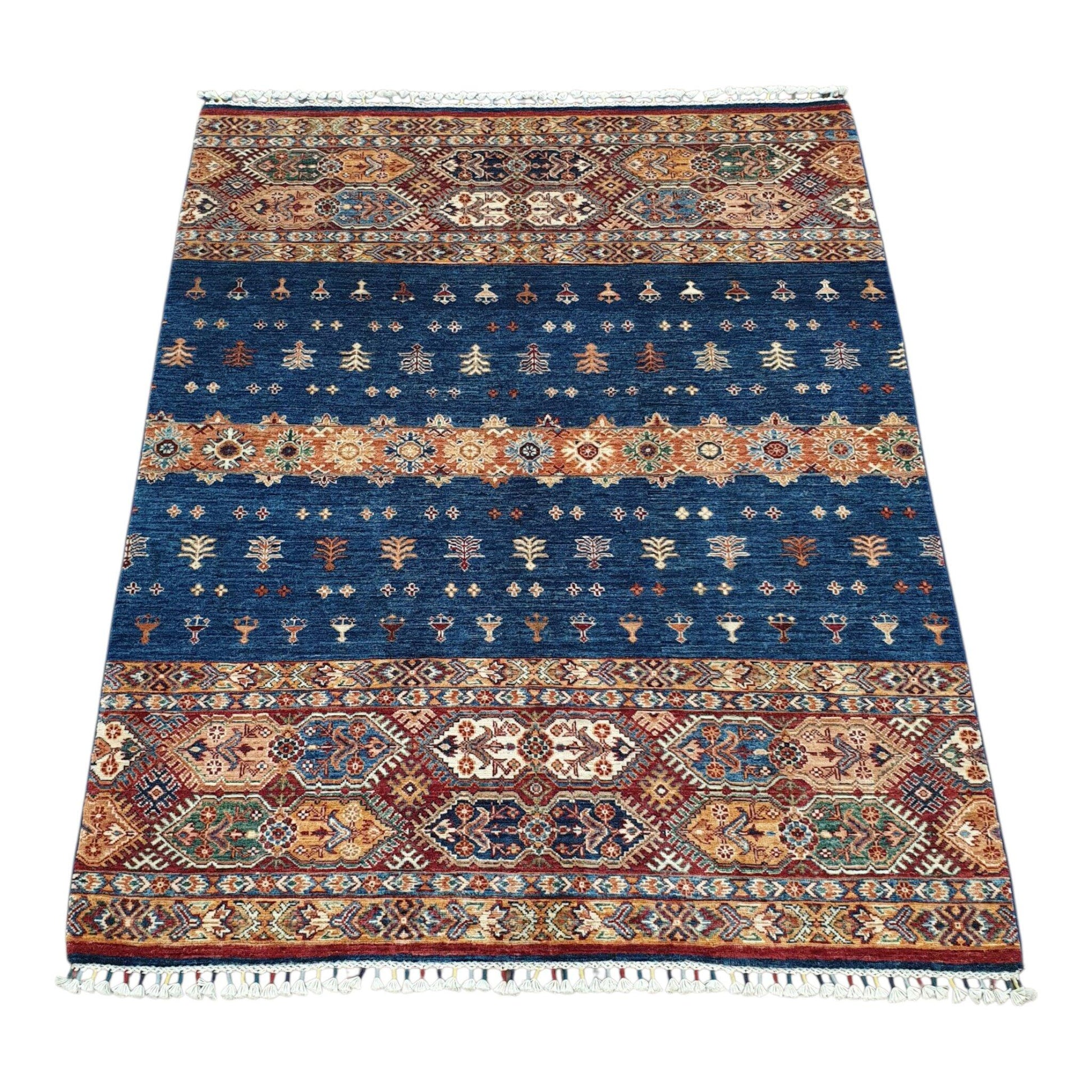 provinces of Afghanistan. Khurjeen rugs are unique because of their pattern and delicate designs specially mixing contemporary and traditional designs together. The wool yarns used are all hand spun and dyed using only natural dyes such as cochineal and indigo, which adds to their vibrant appearance. Once dyed and hand knotted on a cotton warp base in Afghanistan the rugs are then transported over to Pakistan where they are expertly finished including washing and trimming.